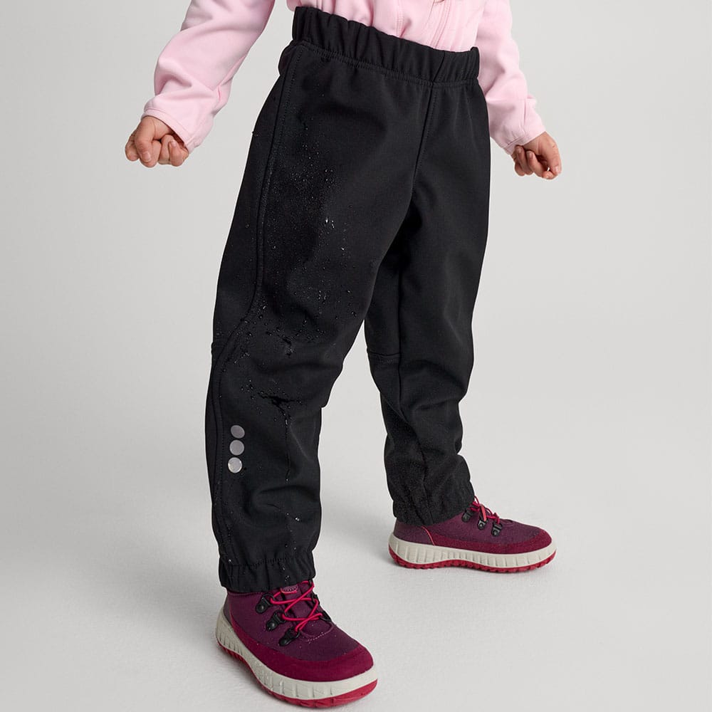 Vindblockerande softshellbyxor för barn, tillverkade av Reima med återvunna fibrer. Perfekta för utomhuslek tack vare den fleecefodrade insidan och justerbara midjan. Matrial som andas bra samt håller smuts och vatten borta. Med knappar och reflekterande detaljer för extra säkerhet. Idealisk för aktiva barn som älskar att leka ute.