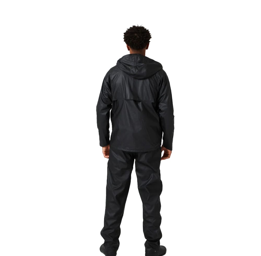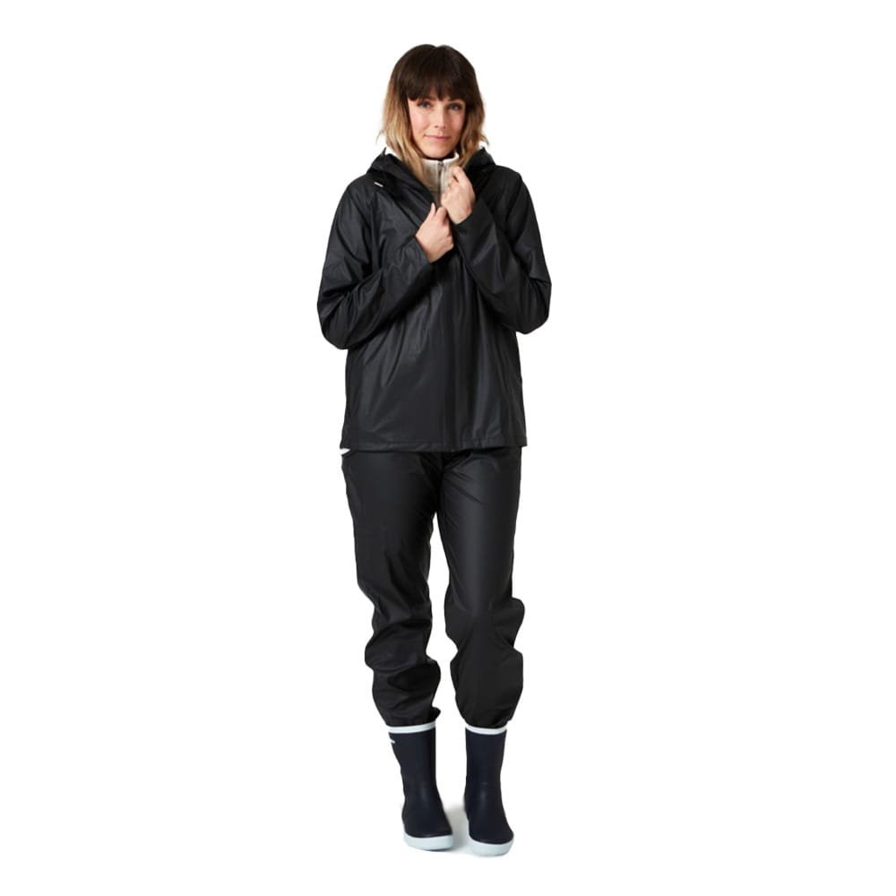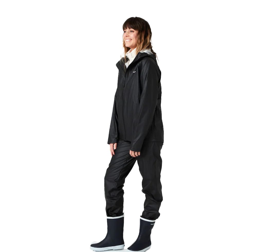 Klassiska regnkläder som enkelt packas ned i regnjackans ficka som omvandlas till väska – perfekta att ta med på resan. Regnjackan är en sportig variant som är lite smalare i passformen och är utrustad med ett ok och ventilation på ryggen. På framsidan hittar vi en vattenavvisande dragkedja och huvudet skyddas av en justerbar huva. Regnbyxorna har en rak passform med resår i midjan och runt benslutet. I midjan finns även en dragsko med snörlås på insidan av linningen för att underlätta att ta av och på byxorna.