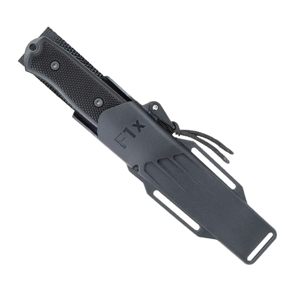 Stark och rostfri överlevnadskniv med svart knivblad av höglegerat pulverstål, handformad egg, Thermorun-skaft och zytelslida.