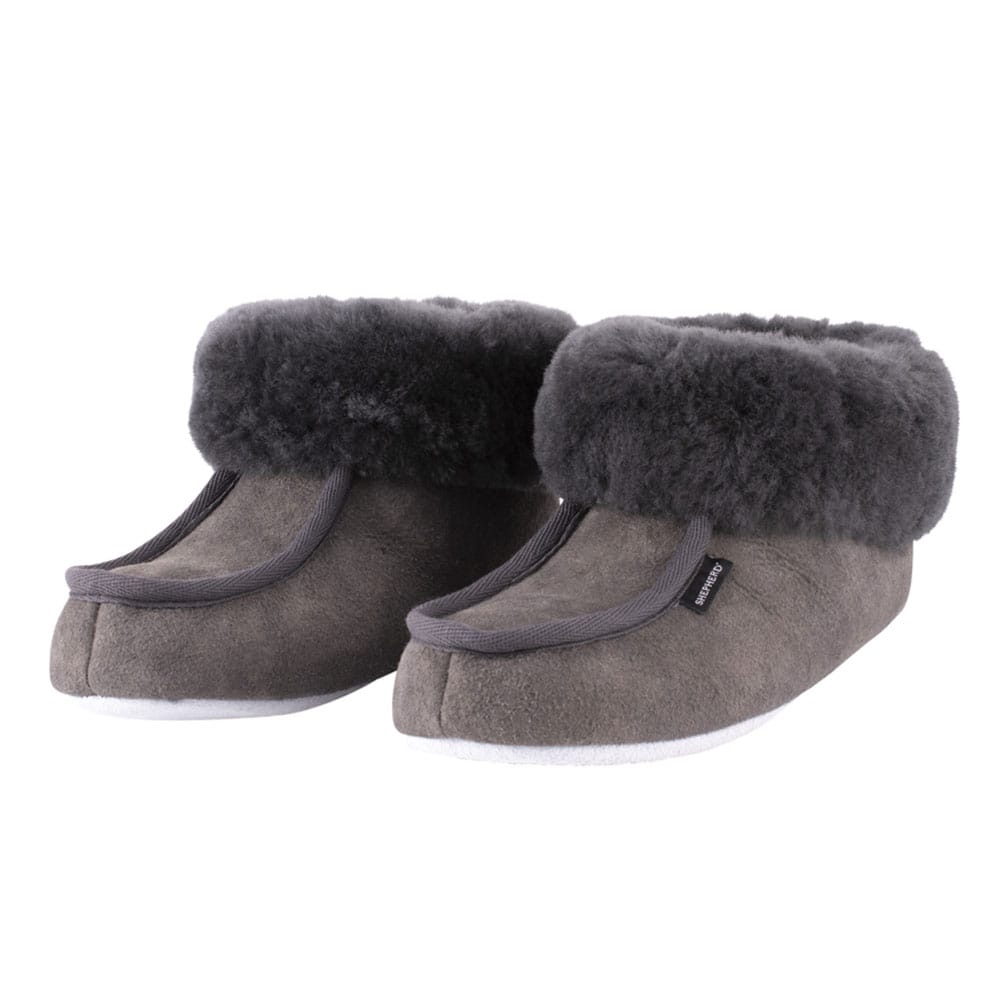 Shepherd Moa är en ankelhög toffla i mjukt och varmt fårskinn. Tofflan har en bred och dekorativ fårskinnskrage samt kantband framtill som en snygg detalj. Den härliga insidan av fårskinn känns skön mot fötterna och yttersulan av mocka gör dessa till de perfekta tofflorna att använda hemma. Tofflan är normal i passformen, vilket gör att du kan ha din normala storlek. Shepherd kan upplevas små i storleken – Vi rekomenderar att gå upp 1-2 storlekar.