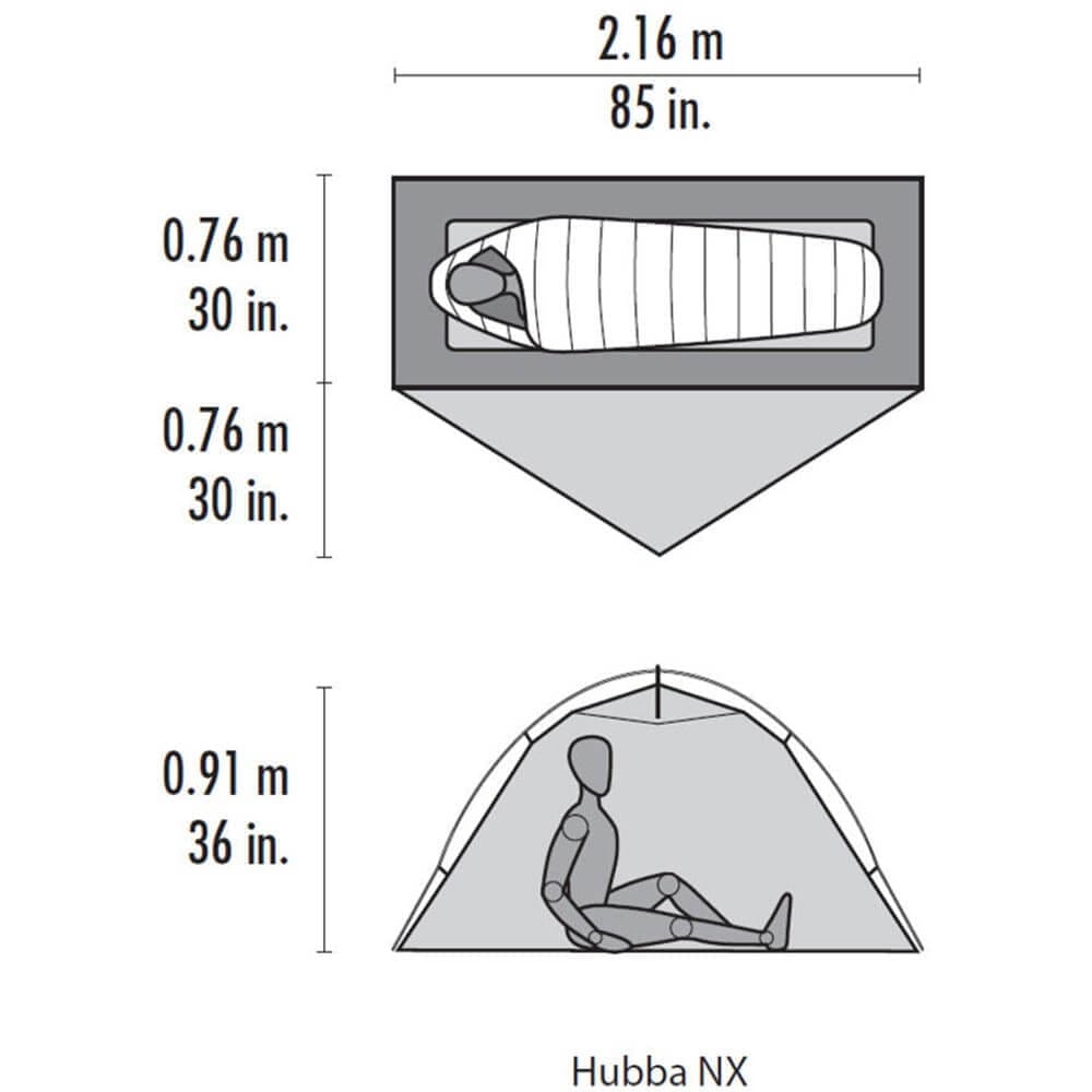 I förhållande till den extremt låga vikten på endast 1,29 kg erbjuder Hubba NX gott om utrymme. Här finns en rymlig sovkabin som mäter 76 x 216 cm och tältets kupolform ger en behaglig takhöjd på 91 cm. Det gör att du kan sitta upprätt utan problem.