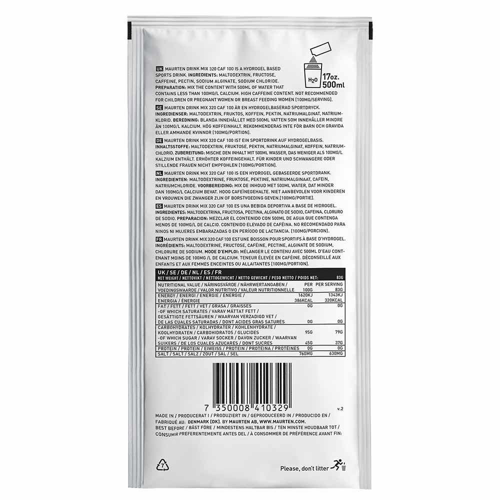 Maurten Drink Mix 320 CAF 100 är en avancerad sportdryck för den aktiva personen som söker optimal energi och vätska under träning. Med 100 mg koffein och 80 gram kolhydrater per portion är sportdrycken optimal för att förbättra prestation och minska ansträngningskänslan. Perfekt för alla träningsnivåer! Innehåller 14 serveringar/portionspåsar..